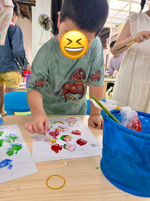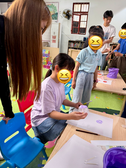 Children worked alongside volunteers to cut and decorate leaves, building a shared tree together - branch by branch. They also used plastic bags and paint to stamp flowers onto the artwork, adding their own colorful touch.
